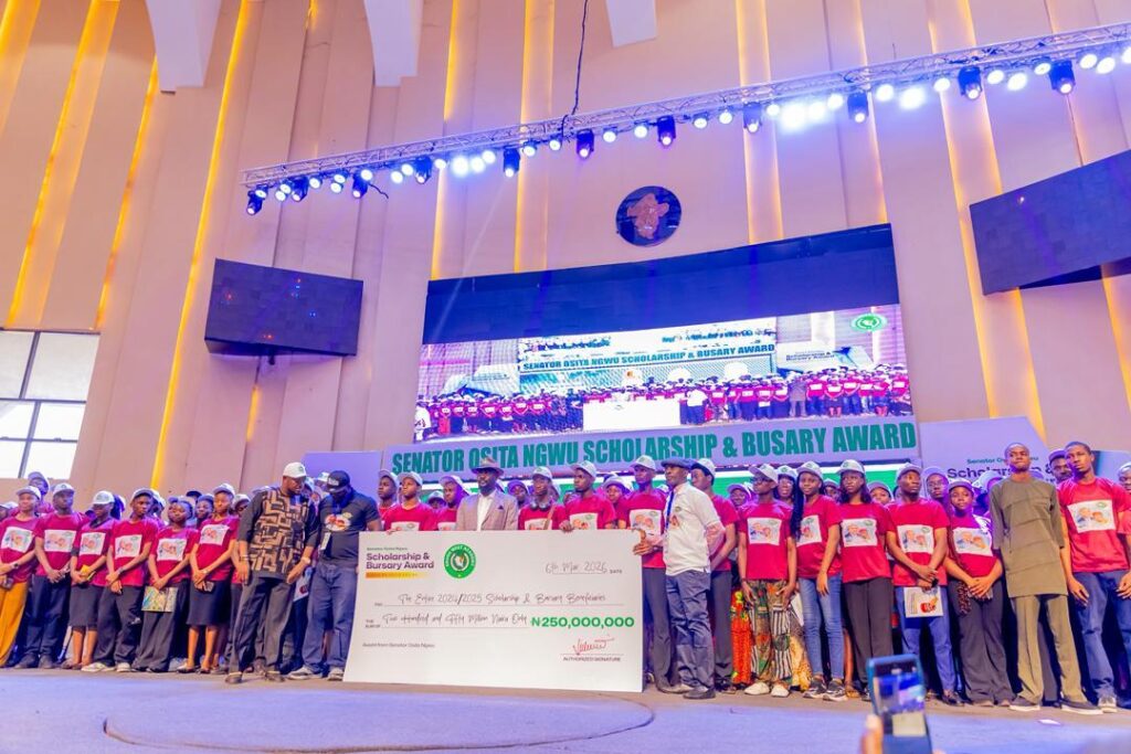 Governor Peter Mbah and the President of the Senate, Godswill Akpabio, have commended the senator representing Enugu West Senatorial District, Osita Ngwu, for disbursing ₦250 million in bursaries and scholarships to students at a ceremony held at the International Conference Centre, Enugu. The scholarship and bursary scheme, now in its second year, is part of Ngwu’s Enugu West Academy initiative aimed at supporting students academically and financially, with beneficiaries including UTME candidates and postgraduate students. Akpabio, who also announced a ₦100 million donation to the academy, described Ngwu’s effort as an uncommon commitment to education and youth empowerment, noting that education remains the most powerful tool for shaping the future.